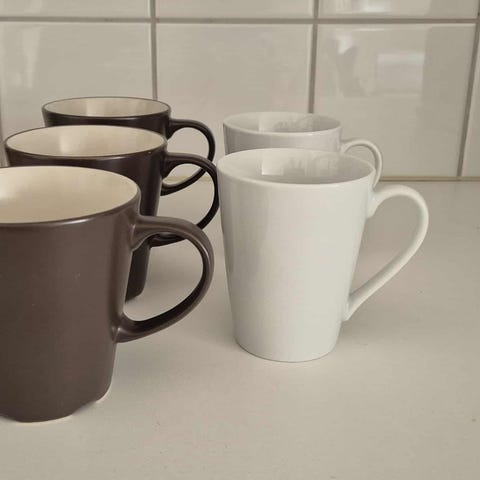 3 IKEA brown and 2 white coffee mugs/3 ruskeaa IKEA:n ja 2 valkoista kahvimukia