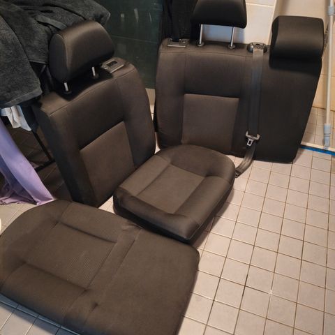VW Bora istuinsetti, joka sisältää etuistuimet ja takapenkki-istuimet. Väri harmaa, materiaali kangas. Istuinsetti sopii VW Bora ja Golf 4 -malliin.