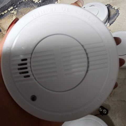Valkoinen paristokäyttöinen palovaroitin. Hinta: 0,50 euroa.