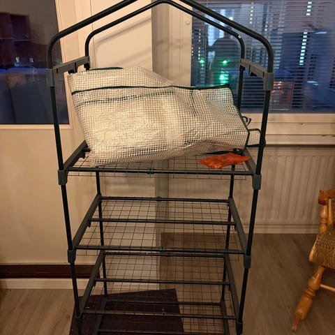 Kevät jo melkein kolkuttelee ovella, niin nyt on vielä hyvää aikaa valmistautua tulevaan kasvukauteen. Pienessä kasvihuoneessa on pari metallista hyllyä sisällä, kaupan päälle istutusruukkuja. Sopii vaikka parvekkeelle tai talon seinustalle.