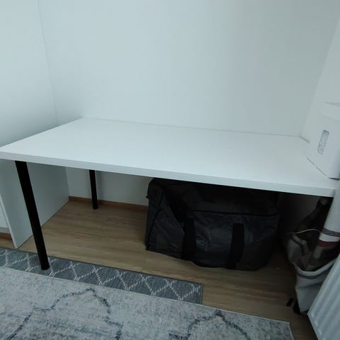 Työpöydässä on muutama kolhu, mutta eivät ole häiritseviä ja ne voi mahdollisesti paikata piiloon. Esimerkiksi työtason ohut naarmu jää hyvin tietokonenäytön taakse piiloon.