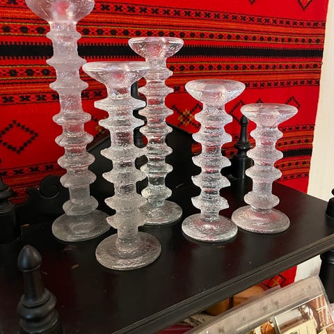 Iittala Festivo kynttilänjalka kirkas lasi. 5 kpl 12 cm, 1 kpl 18 cm. Kaupan päälle liimattu kork 24 cm.
