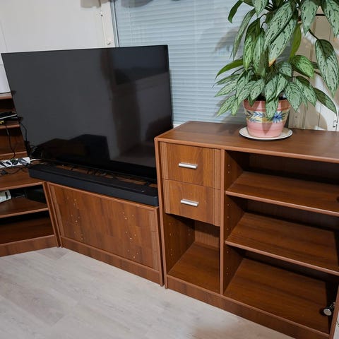 Tukeva ja siisti TV-sehpa, jossa liukuovet (lasi/puu).