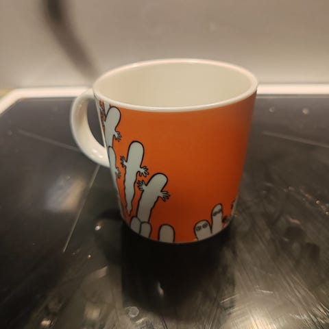 Arabia hattivatti muki ja kulho. Käytettyjä ja pesty astianpesukoneessa. Kupin ulkopunnassa tummia jälkiä (kuvat), muuten ehjiä.