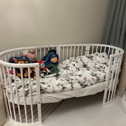 Hyvässä kunnossa oleva Stokken lastensänky +patja uuteen kotiin. Toimii myös taaperolle, kun laidan saa saa irti ja pohjaa säädettyä eri korkeuksille. Sängyssä myös lukittavissa olevat pyörät, jolla sänkyä helppo liikuttaa.
