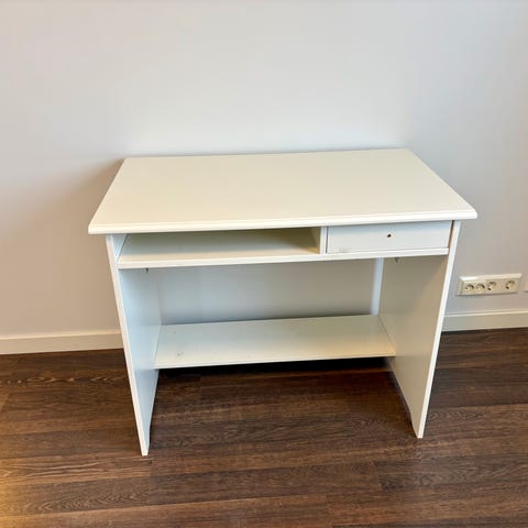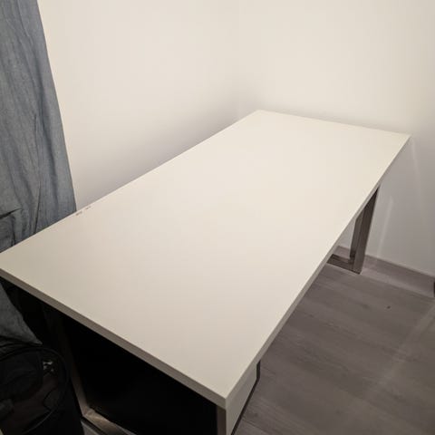 Isku pöytälevy ja metalliset jalat, kaksi jalkaa ja keskituki nyt irronnut ja vaatii uudelleen kiinnittämisen