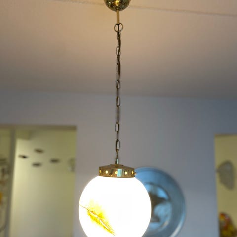 Kaunis lasinen riippuvalaisin messinkisillä yksityiskohdilla.