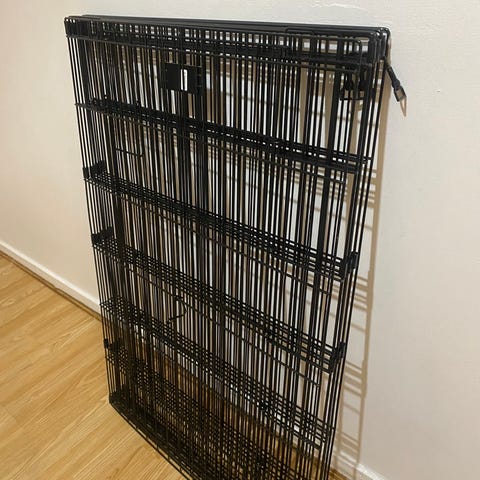Metallinen pentuaitaus musta, jossa on portti. Ulkomitat 122x80 korkeus 70. Helppo kasata. Kevyt.