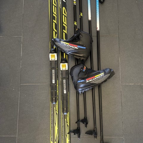 Suksipaketti noin 110-115 cm pituiselle hiihtäjälle.