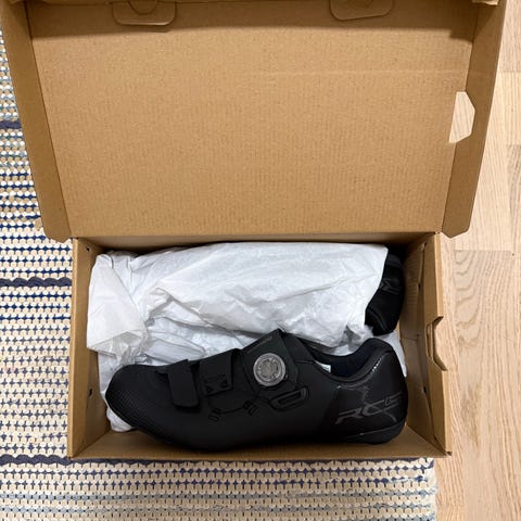 Shimano maantiepyöräilykengät koko 43, väriltään mustat. Kengissä on tarrakiinnitys ja solki, jotka mahdollistavat säädettävän istuvuuden. Mukavat jalassa.