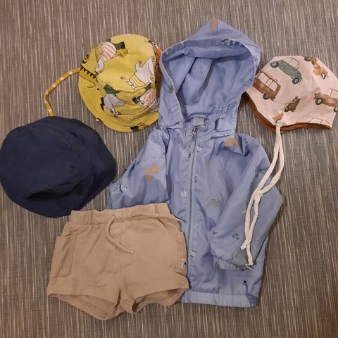 Lasten vaatteet tytöille, koko 86. Kuvassa erilaisia vaatekappaleita, mukaan lukien haalari ja pitkähihainen paita. Vaatteet soveltuvat käytettäväksi arjessa ja leikeissä.