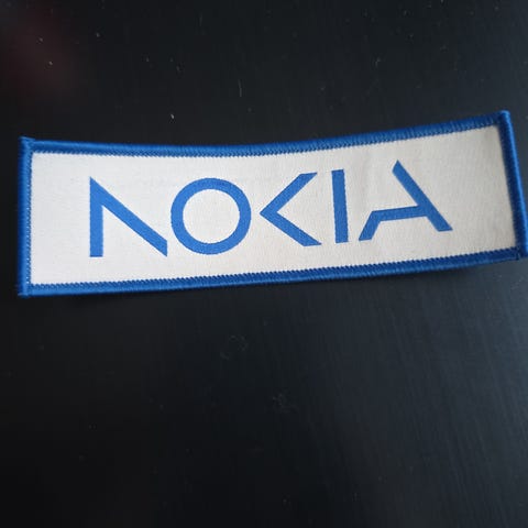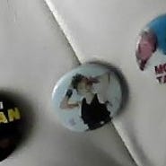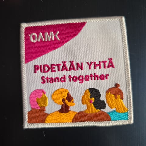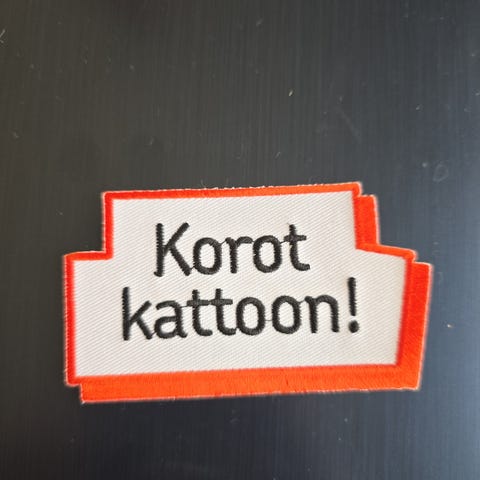 Myydään Kuumaa -bändin kangasmerkki. Ollut ommeltuna pipoon, siksi reunoilla pienenpientä jälkeä ompeleista (näkyy parhaiten kuvassa 3).
