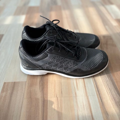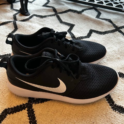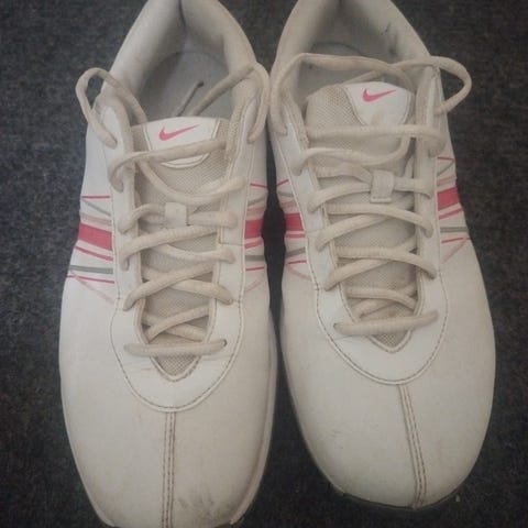 Nike Air Zoom -golfkengät. Koko 40,5. Ne ovat valkoiset, ja niissä on musta logo ja punaiset tikkaukset.