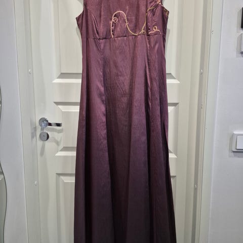 Vanhan rosan värinen pitkä ilta- juhlapuku koko 34-36. Empire-tyylisen etuosan mitta 72 cm rintojen alta ympäri mitattuna. Kainalosta helmaan mitta 118 cm (lyhennettävissä). Ollut päällä yhden kerran.