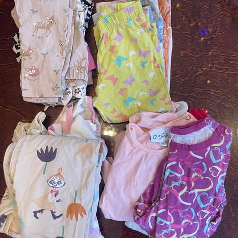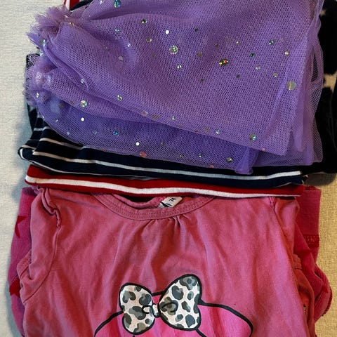 Hyvässä kunnossa mekkoja ja paitoja ja takkeja koko 62-86. Paketissa eri merkin vaatteita.