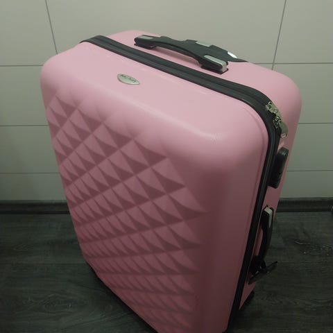 Sininen matkalaukku. Jos laukku on täynnä vaatteita, laukku näyttää samanlaiselta kuin ensimmäinen kuva. Jos laukku ei ole täynnä vaatteita, laukku näyttää samanlaiselta kuin kolmas kuva. Materiaali on ohut, mutta laukku on täysin käyttökelpoinen jokapäiväiseen käyttöön tai matkustamiseen.