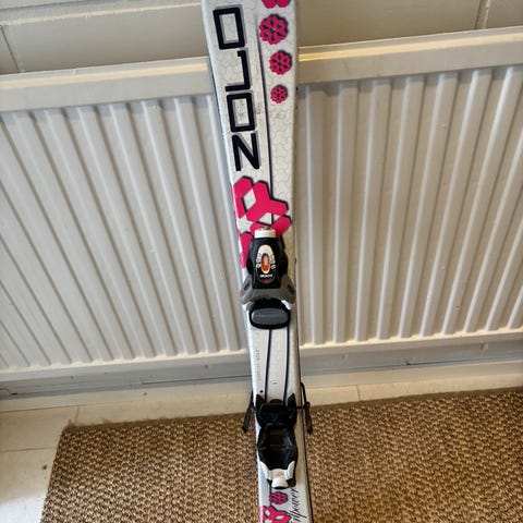 Tässä paaaaljon käytetyt sukset lapselle. Viime talvena vielä oli käytössä ja hyvin pelitti, mutta nyt ovat lyhyet. Toisen siteen yksi keppi on poikki, siitä kuva. Ei haittaa menoa ja side toimii silti. Auranlaaksossa.