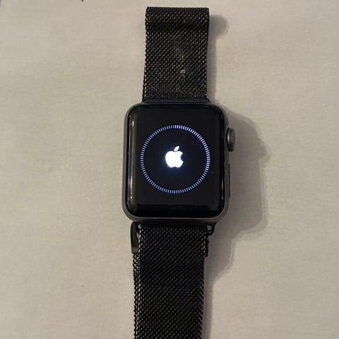 Apple Watch älykello vaaleanharmaalla rannekkeella. Tuotteessa mukana alkuperäinen pakkaus ja latauskaapeli.