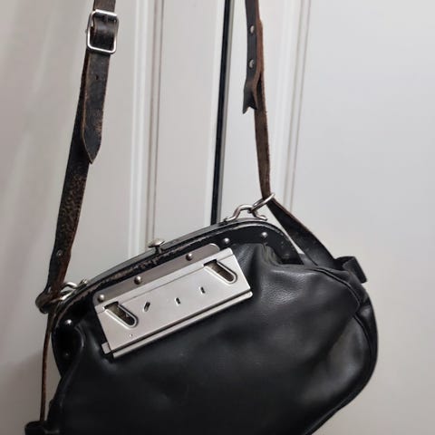 Uutta vastaava rahastajan laukku paksua nahkaa, sisusta haljasnahkaa, sisällä sivulokero, ulkopuolella lokerot molemmin puolin.