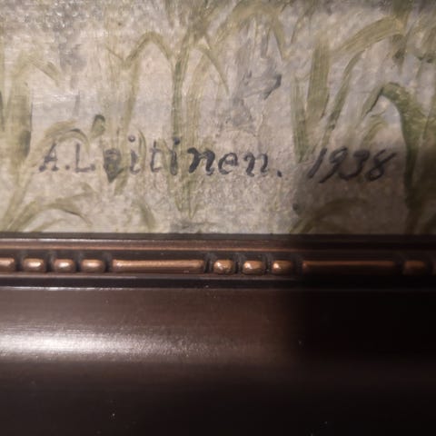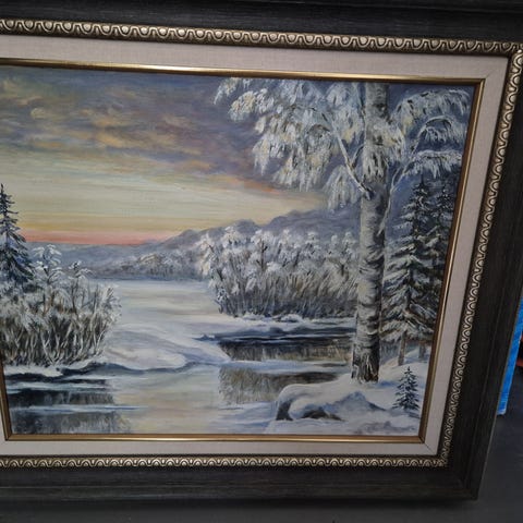Pekka Laihon öljyvärimaalaus, jossa on talvimaisema. Teos esittää rakennuksia lumisessa ympäristössä ja on kehystetty. Maalauksessa on kauniit, luonnonläheiset värit ja upeat luonnonvalkeat/ harmaansävyiset kehykset. Erittäin hyväkuntoinen.