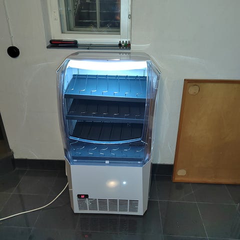 Uusi käyttämätön Metalfrio jäähdytyskaappi, jossa on useita hyllyjä tuotteiden esillepanoa varten. Hyllyväliin korkeutta saa säädettyä tarpeen mukaan. Laite on valkoinen ja varustettu kirkkaalla etu- ja sivupaneelilla, jotka mahdollistavat tuotteiden näkyvyyden. Näyttö osoittaa lämpötilan, joka on säädettävissä tarpeen mukaan. Korkeus n. 113cm, leveys n. 66cm ja syvyys n. 56cm.