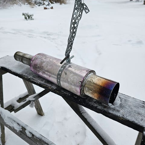 Ylimääräiseksi jäänyt joskus motonetistä ostettu hiilikuitu sport äänenvaimennin. Kolhuja siellä täällä mutta hyvät äänet ainakin saa :D
