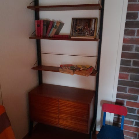 60-luvun kotimainen täyspuinen kirjahylly. Kaapin ovet siirrettävissä haluttuun kohtaan hyllystössä.