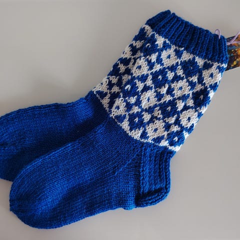 Kummitätini puolesta myyntiin hänen kutomiaan, uusia villasukkia. Sukat on kudottu kodissa, jossa asustelee myös kissa. Lankana Novitan 7 veljestä.