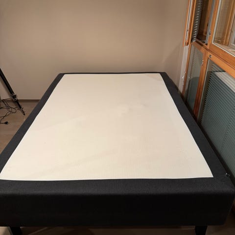 Puolikiinteä tummanharmaa sänky, paksuus 34 cm.