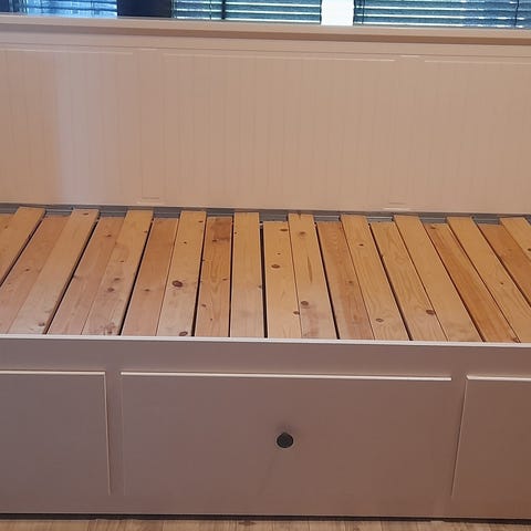 Hyväkuntoinen Ikean sohvasänky. Vasemmassa päädyssä yhdessä kohdassa nirhaumaa maalissa (näkyy kuvassa). Rakenne hyvä, eikä muita selkeitä puutteita. Purettu juuri äsken suoraan käytöstä. Ei ole ihan pieninä osina, mutta voidaan purkaa vielä lisää, jos noudetaan henkilöautolla.