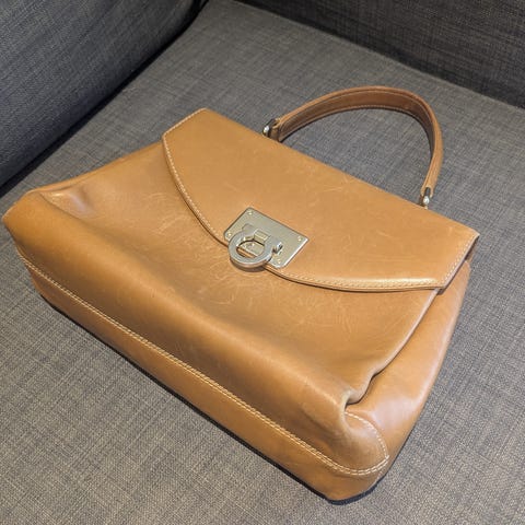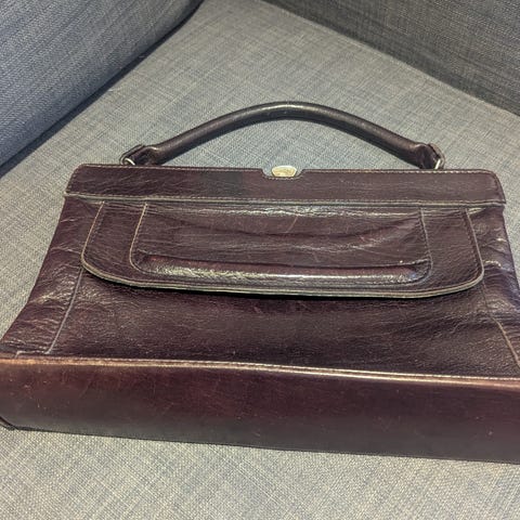 Tummanruskea salkkumallinen/suorakulman muotoinen täysnahkainen Suomessa valmistettu olka-/käsilaukku. Laukku on kotimaista designia ja uniikki vintage 1970-luvun lopulta. Laukku on ryhdikäs, tukevaa aitoa nahkaa.