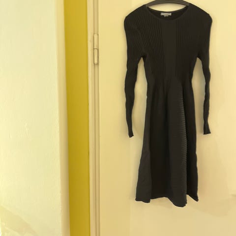 Kaunis mekko ohuehkoa, kuvioitua viskoosia. Joustava kuminauhavyötärö ja tekohelmin koristellut hihansuut. Kuvista näet yksityiskohtia. Mekko ei ole ollut käytössä, joten vastaa kunnoltaan uutta. Noin 178 cm pituisen päällä mekko jättää nilkat näkyviin.