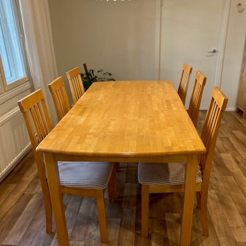 Iso ruokapöytä ja kuusi tuolia. Vähäisellä käytöllä ollut. Ei paljoakaan käytön jälkiä.