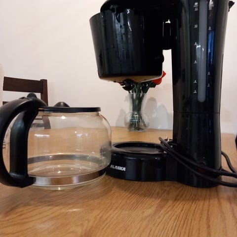 Täysin toimiva ja hyväkuntoinen kahvinkeitin. Muoviosissa hieman väripinttymää.
