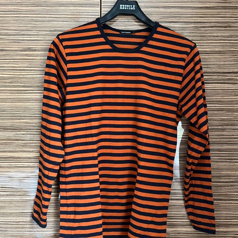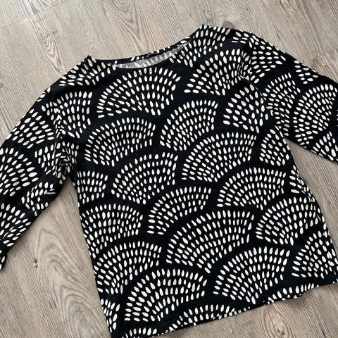Myydään siistikuntoinen Marimekko trikoopaita, materiaali on 100% puuvillatrikoota. Paidan on suunnitellut Marja Suna. Kainalo-kainalomitta on 53 cm ja pituus on 64 cm.