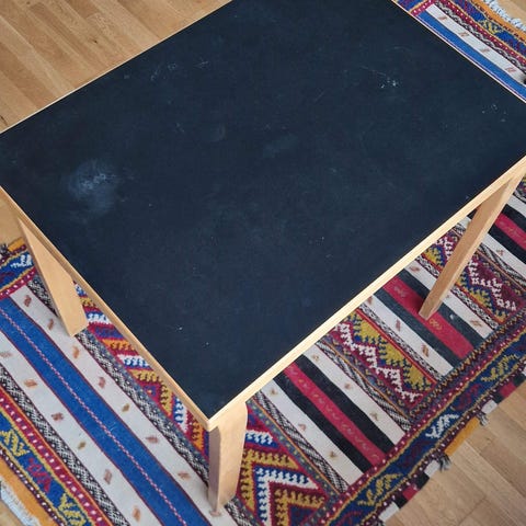 Musta laminaattipinta. Reunalistat ja jalat lakattua koivua, iänmukaista kulumaa ja käytönjälkiä. Siististä kodista, on puhdas ja hajuton.
