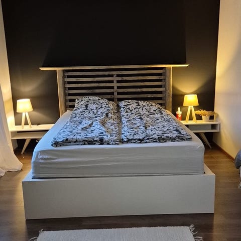 Massiivi puusta valmistettu valkolakattu sängyn pääty. Leveys 190 cm, korkeus 95 cm