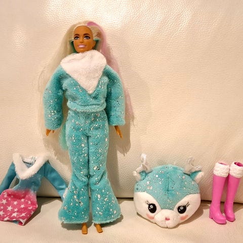 Barbie tai barbietyyppinen enkelinukke. Nukelle kuuluu irrotettava jalusta. On ollut koristeena. Varastoinnissa hieman rähjääntynyt.