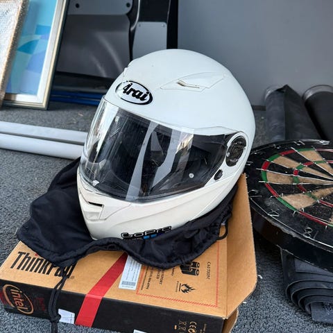 Kypärä on n. 4-5 vuotta vanha, ei ole kolhittu tai kaaduttu. Kypärä on avattava ja lisänä aurinkosuoja. Koko on XL. Ajohanskat koko XL.