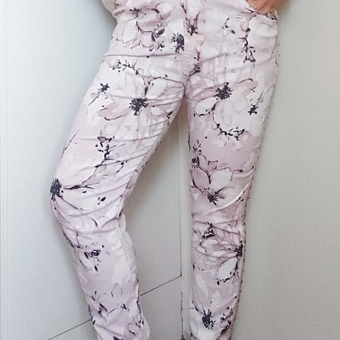 Käyttämättä jääneet, erittäin hyväkuntoiset vaalean roosat joustavat joggerit. Midi vyötärö ja taskut sivuilla, ei takana. Materiaali viskoosia, puuvillaa ja elastaania. Leveys vyötäröltä enimmillään 48cm (kuminauhavyötärö) ja sisälahkeen pituus on 70cm. Ainoa moite on vyötärökaitaleen kuluma. Ei näy paidan alta mihinkään.