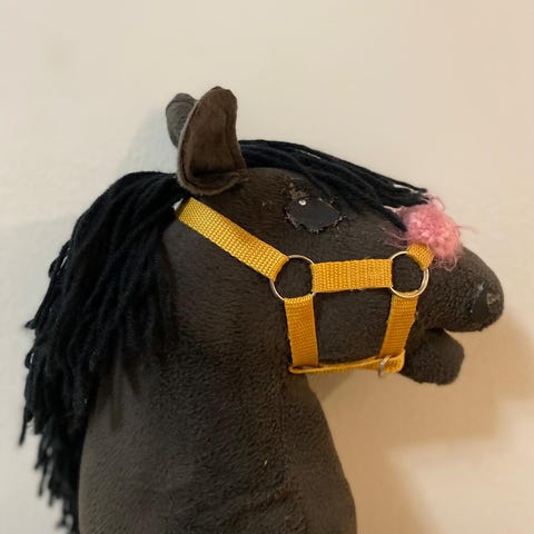 Raidallinen, itse tehty keppari. Harjan langassa kimalletta. Toisessa silmässä tahra glitteriliimasta, ks. kuva.