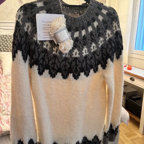 Alasuq- villapaita Alafoslopista. Pari kertaa päällä käynyt. Käytännössä uusi. Koko L. Mitat kainalo-kainalo 50, kainalo-helma 44, kainalo-hiha 49, olka-helma 73.
