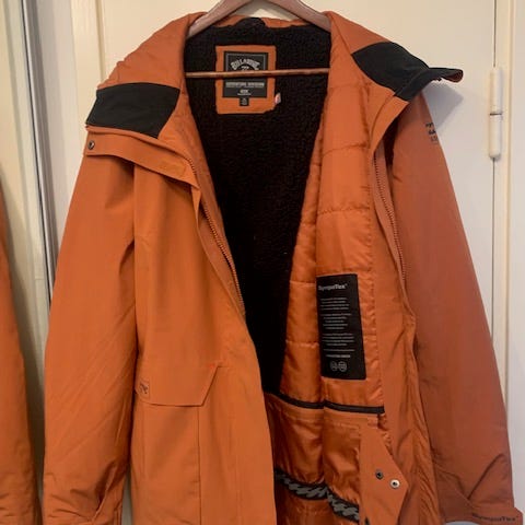 Sini oranssinen laskettelu takki. Takki erittäin hyvässä kunnossa. Viimeisessä kuvassa näkyy kainalon vetoketju jolla voi avata kainalon kankaan. se on molemmilla puolilla. Kokoa en tiedä, mutta on poikien mallia. Takissa voi olla pientä kuluma jälkeä, mutta ei pitäisi haittaa käyttöä. Kiristettävä lantio osa.
