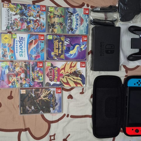 Mukaan tulee kuvan mukaiset lisävarusteet ja pokemon pelejä myöskin konsoli kiinni ittsessään switchissä kyseessä siis pokemon exclusive pikachu edition.