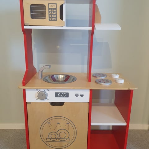 Ikean hyväkuntoinen leikkikeittiö, jossa paljon ruokatarvikkeita.
