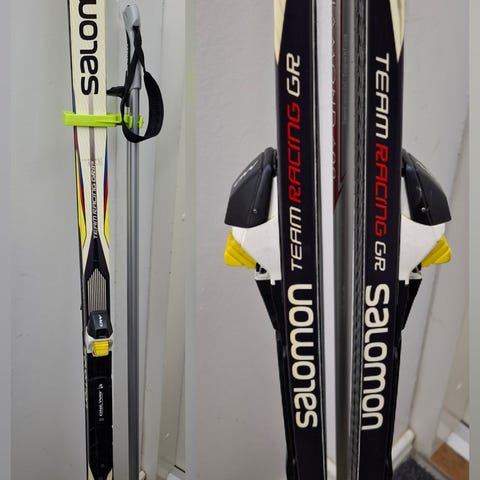 Sukset 150cm + sauvat 115cm. Toisesta suksesta peräpäästä pieneltä matkalta pohja irvistää.