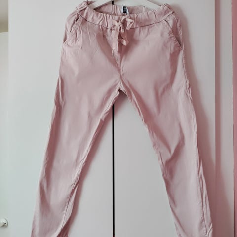 Käyttämättä jääneet hyväkuntoiset joustavat joggerit. Korkea vyötärö ja taskut sivuilla ja takana. Materiaali 95% viskoosia ja elastaania. Leveys vyötäröltä enimmillään 55cm (kuminauhavyötärö) ja sisälahkeen pituus on 70cm. Sivuilla kauniit strassikoristeet koko pituudelta.