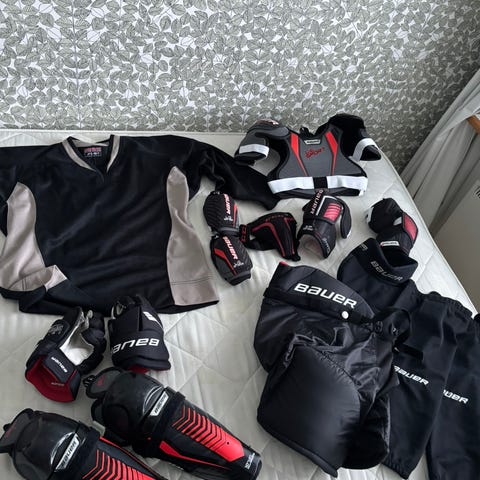 - Bauer hartia-, kyynär- ja säärisuojat, sekä pelihousut ja jääkiekkohanskat