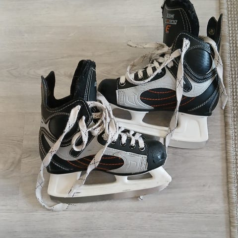 CCM Fusion 32 hokkarit kokoa 1 (vastaa noin kokoa 32). Pohjallisen sisämitta 20,5 cm. Nämä on aikoinaan ostettu käytettynä ja ollut pojalla parina talvena käytössä koululuistelussa. Käytön jälkiä näkyy, vuoressa nukkaa sekä luistimen terän ulkopuolella tummentumaa.