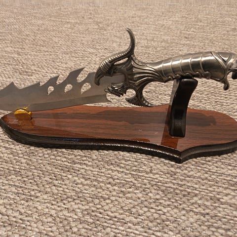 Kuvan mukainen veitsi. Kahvassa ilmeisesti muovia tms, (puulta näyttävä osa). Muuten metallia, paino 543g.